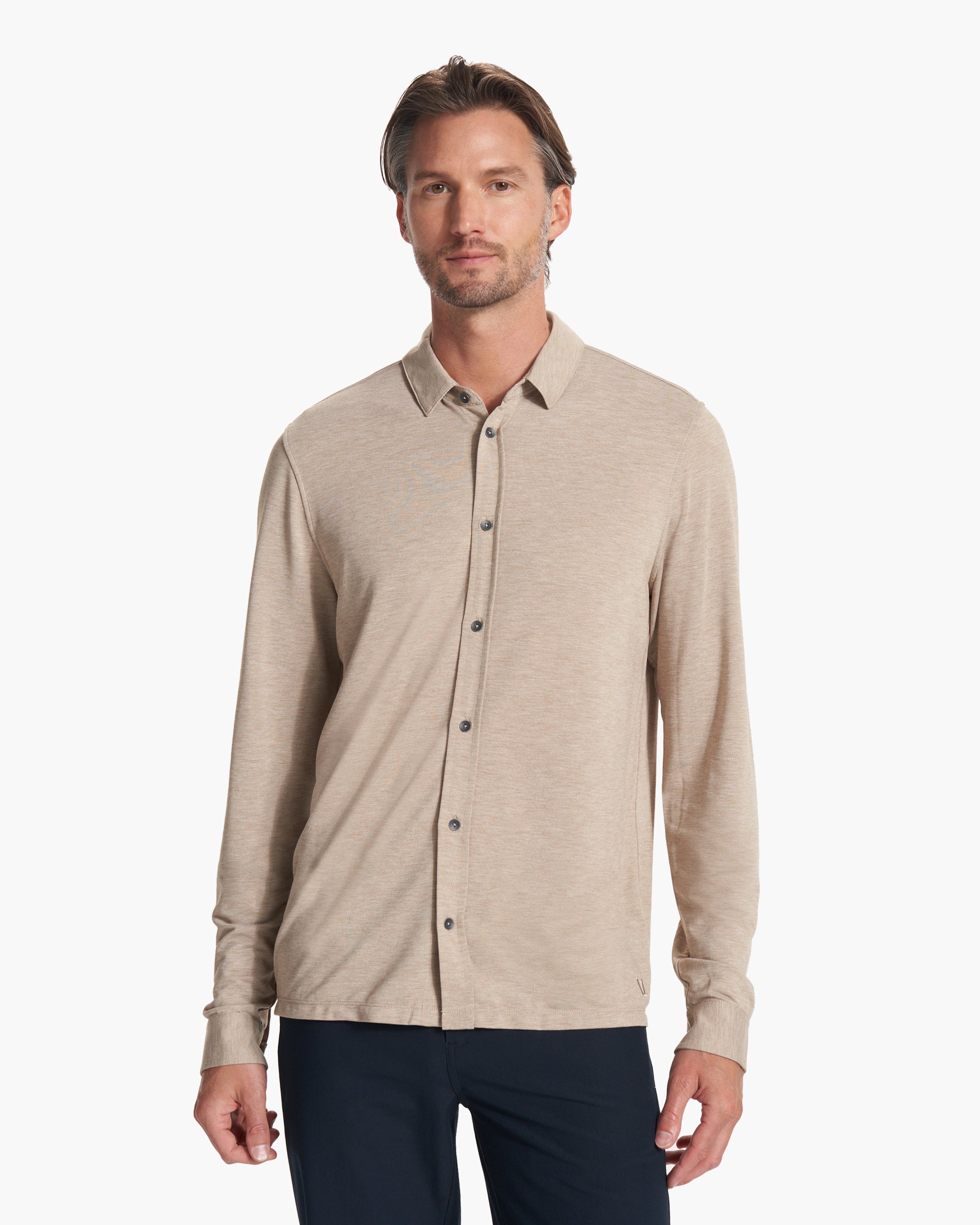 When function meets form. This button-down long sleeve shirt is built with over 50% recycled performance knit twill that's moisture wicking and made with stretch.